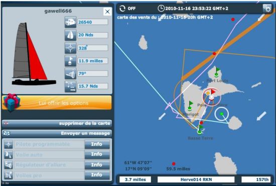 Quant à moi, j'ai mené par la face nord mon Herve014 RKN à la 157ème position du général soit la 3ème place des sans option après deux dernières nuits particulièrement courtes... Arrivée avec 15 minutes d'avance sur Francis Joyon malgré tout et sans avoir reçu le moindre embrunt! Notez la trace de mon tour de Guadeloupe quelque peu étrange en raison d'un des nombreux bugs qui a retardé mon arrivée au delà 2h30 du matin au lieu des 1h35 prévus!